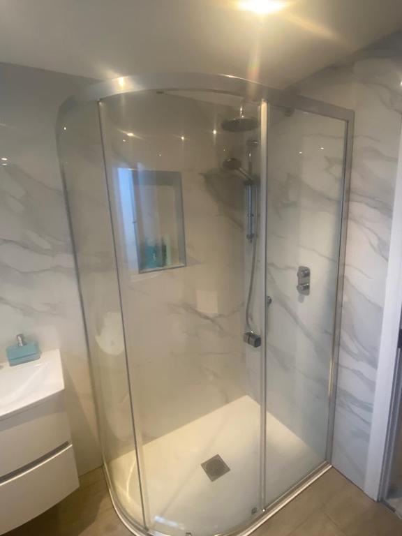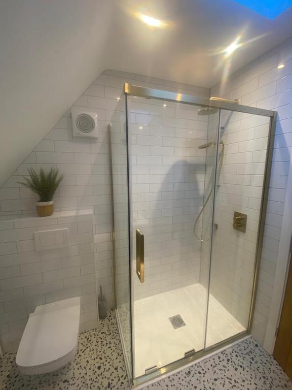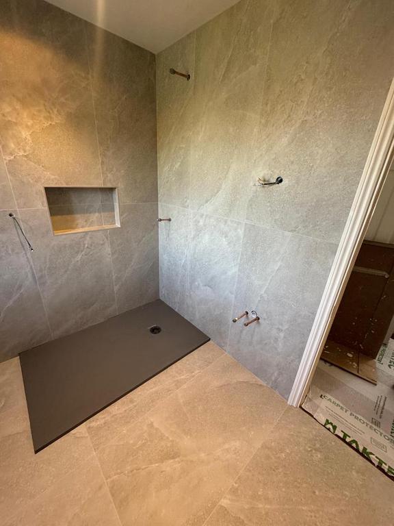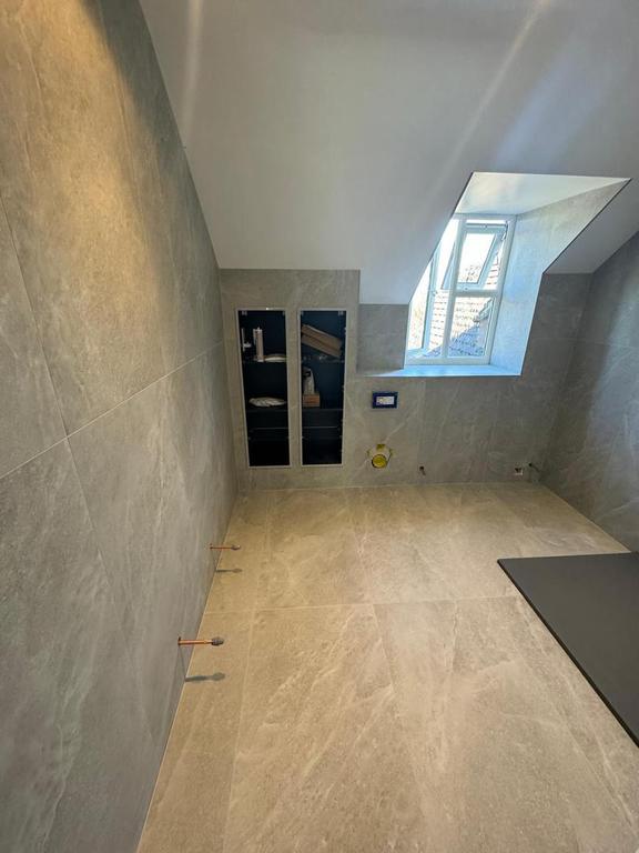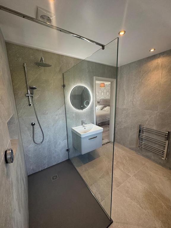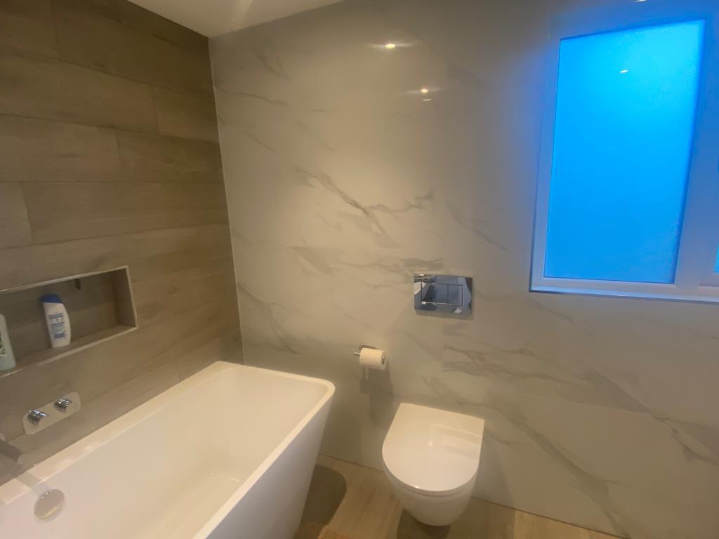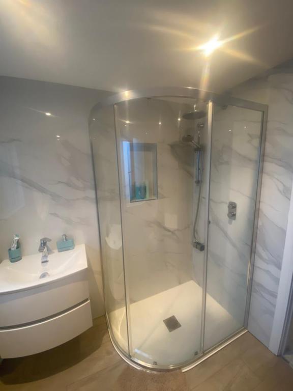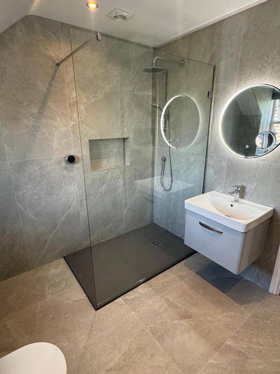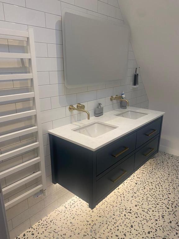 This is a project in a private residence which included the removal of an old 80's bathroom suite. The brief was to supply and fit a new "Touchstone" shower tray coupled with an elegant Merlyn Arysto shower screen, Aqualisa Quartz shower, towel rail, bathroom furniture and featuring an HIB illuminated mirror. We also supplied and fitted a concealed cistern Geberit toilet system, bespoke wall cupboards and we were responsible for all tiling and finishing. A fantastic modern shower room managed by us from start of the project to the conclusion.